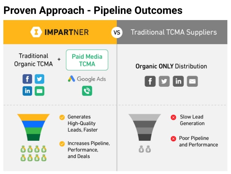 Historically, traditional TCMA has been positioned as the solution to increase brand awareness and lead generation. While possible to an extent, the ability to greatly impact the top of the partner funnel with traditional TCMA is limited to organic efforts. In fact, traditional TCMA is more valuable when leads are already in the funnel. It is essentially a powerful tool for lead nurture.